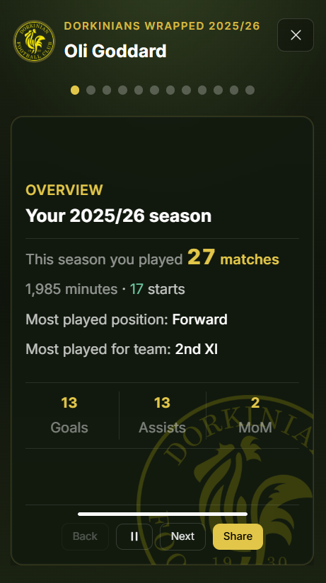 Use the Open Season Wrapped action to launch the full-screen wrapped experience for the selected player and season.
