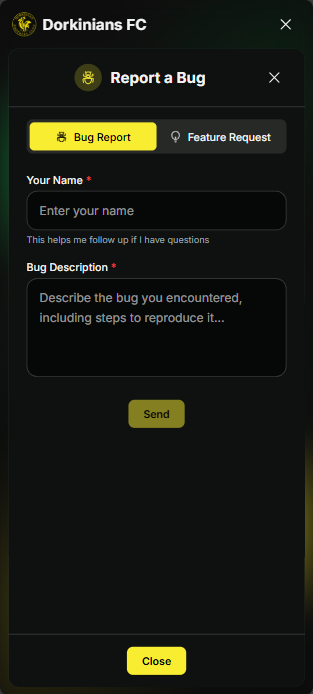 A report bug / request feature button is provided to allow you to report bugs or request features.