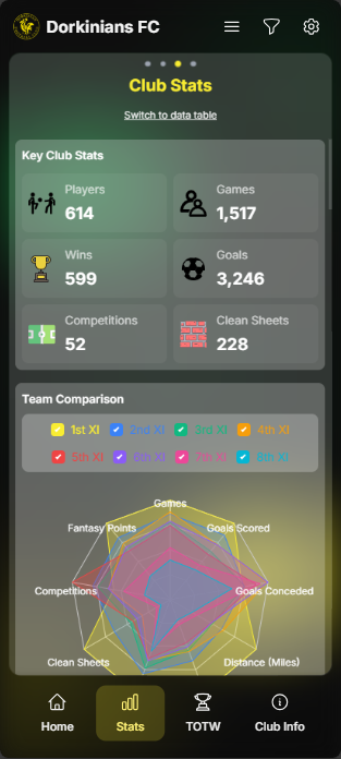 The Club Stats section provides club-wide statistics and comparisons across all teams. This section gives a comprehensive view of the entire club's performance.