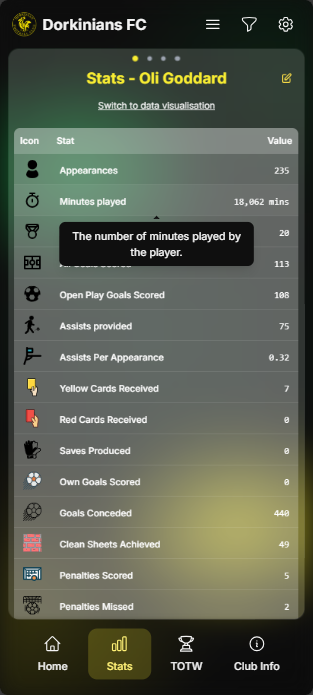 - Minutes per Stats - displays efficiency metrics, displaying how many minutes of play are required for various statistics including minutes per goal, minutes per assist and minutes per clean sheet